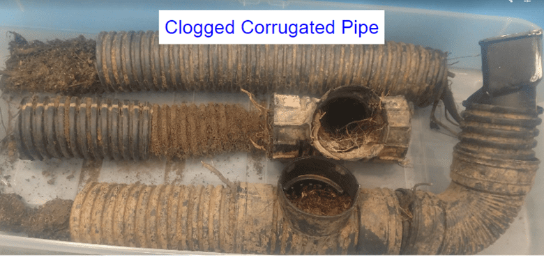 -They do not consist of corrugated pipes. Corrugated pipes are commonly used in our area – and in our opinion, they are for temporary, above ground use only. They hold standing water and silt allowing mosquitoes to breed and seeds to root and clog the pipes. Water standing in corrugated pipe attracts roots which grow through the loose, leaky fittings and into the pipe causing clogging, often in just a few years’ time. The yard must then be retrenched so the pipe can be replaced since corrugated pipe is not strong enough to handle mechanical root removal equipment.