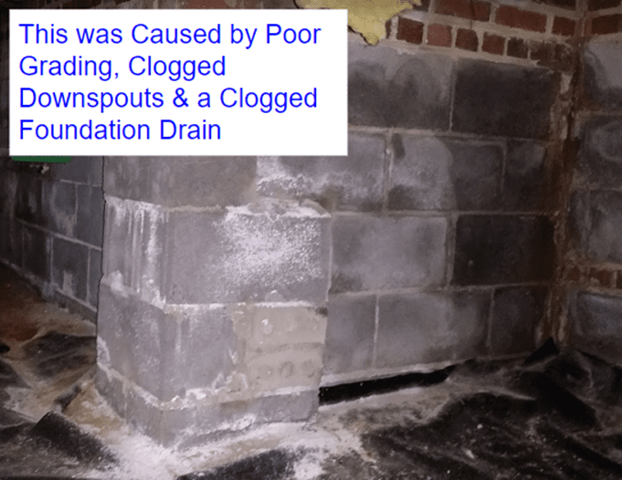 Even if there is no standing water in the basement or crawl space, water can lay unseen in the concrete block leaching out and saturating the base of the homes’ footings. By the time we see standing water in crawl spaces or near basements walls, there may be several inches sitting in the block, below grade, or stagnant in the foundation drain system. Building code prohibits building on soft/ unstable soil but once inspections are over, inadequate, unmaintained drainage systems cause Homes to sit on soft, wet soil causing costly damage and unhealthy conditions.